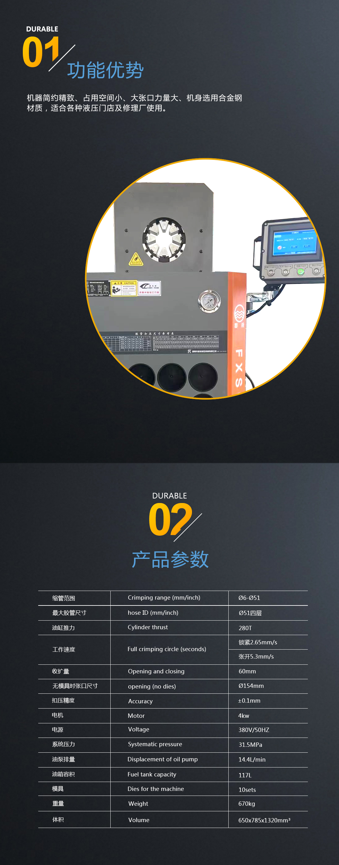 我公司新研發(fā)成功了超薄系列縮管機,扣壓重復精度可達到0.1mm。超薄的結構形式克服了傳統(tǒng)環(huán)形扣壓機固有的不足,能夠非常方便的扣壓形狀復雜的高壓油管總成和異型軟軸軟管。此款機器外觀尺寸更小,采用人性化設計,更方便使用者操作。控制系統(tǒng)采用的是PLC+觸摸屏模式,位移傳感器采集信號精度高,系統(tǒng)可采用手動、半自動和全自動三種模式,用戶可根據(jù)實際加工的工況非常方便的進行選擇,從而大大提高加工效率。在您使用的過程中如遇到有不方便之處請及時與我們聯(lián)系,我們將以不懈的努力提高您的產(chǎn)品質(zhì)量和工作效率。
